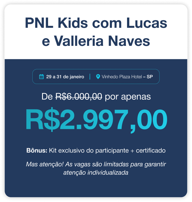 Lucas e Valleria Naves vão conduzir um treinamento presencial que ensina crianças de 7 a 12 anos a aplicarem PNL para vencer inseguranças, melhorar os estudos e se comunicar com clareza, desde cedo.